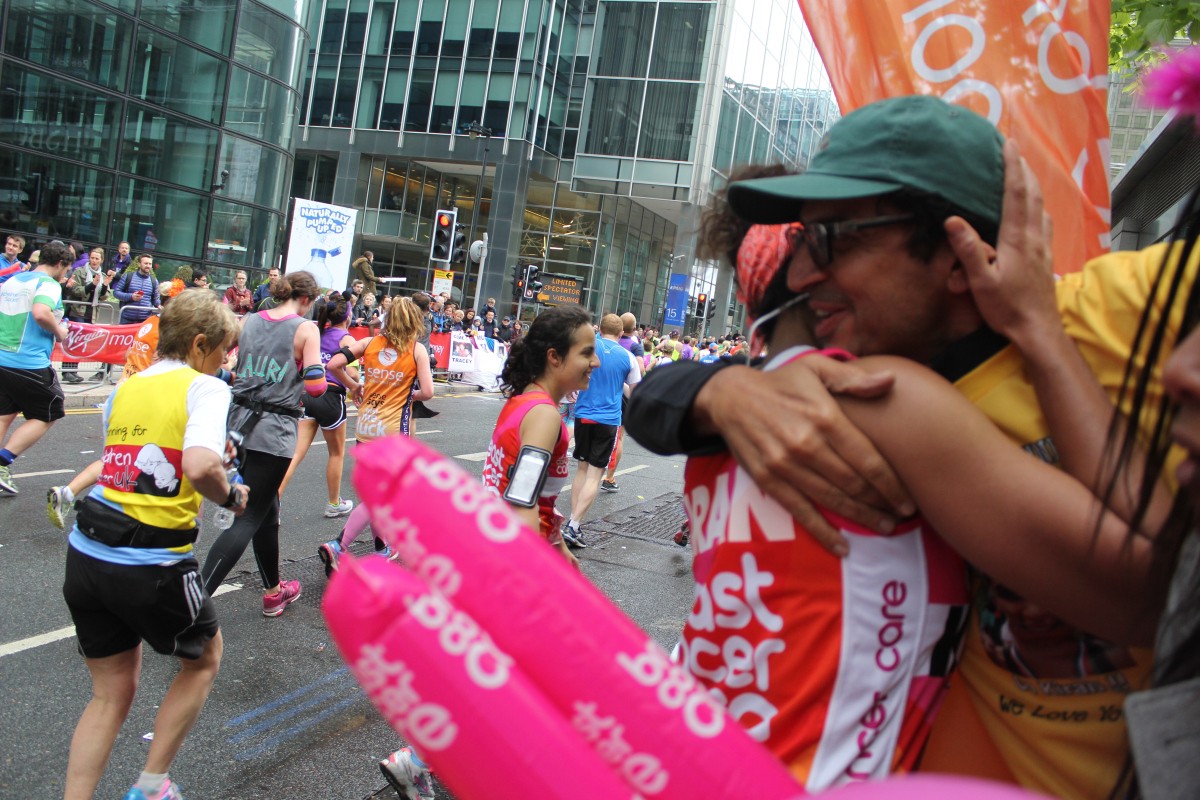 But there was this moment where it's mile nine and by this point, I'm showing. It's very clear that I have it. I know that I'm about to go see my dad and brother who are supposed to be positioned at the 9-mile mark with the rest of the breast cancer cheer point. I feel very awkward because I don't want them to feel awkward. I don't want it to be a thing. Your dad and brother are different than an audience of people you don't know. But with them, I remember trying to pull my shirt down and they didn't give an eff. They did not care. They just scooped me up into their arms, my dad was trying to take photos. It was a super-wonderful moment. That really was a turning point for me as well. It made me emotional.